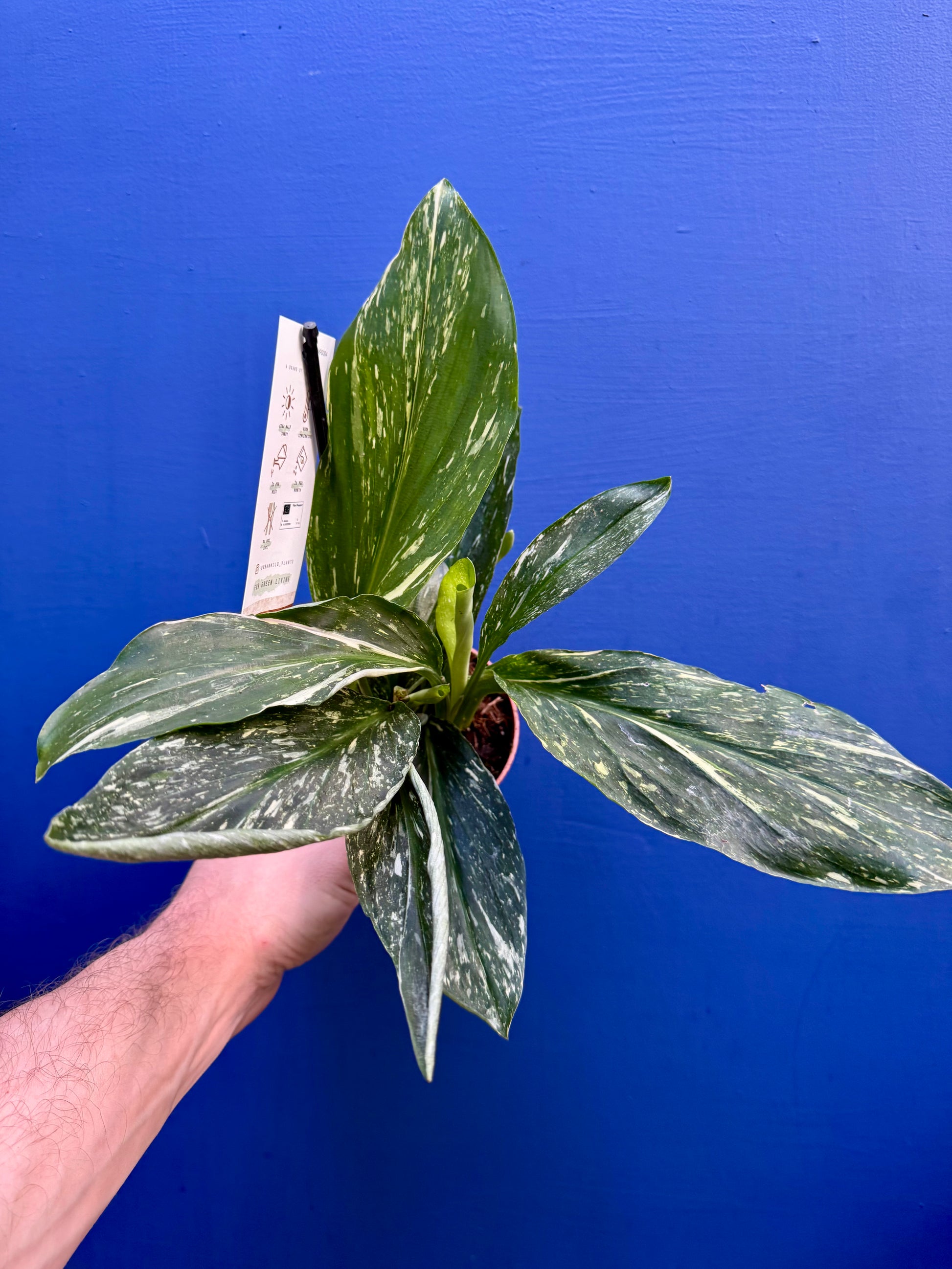 Its broad leaves are beautifully marbled with splashes of cream, and green. Compact and low growing, it’s a rare treasure that adds colour and intrigue to any plant collection.